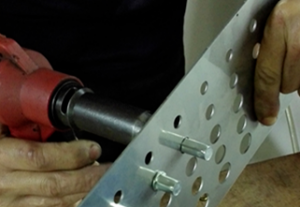 4. 把拉铆螺母枪与拉铆螺母穿进薄板铁上再按一下拉铆螺母枪开关进行拉铆。