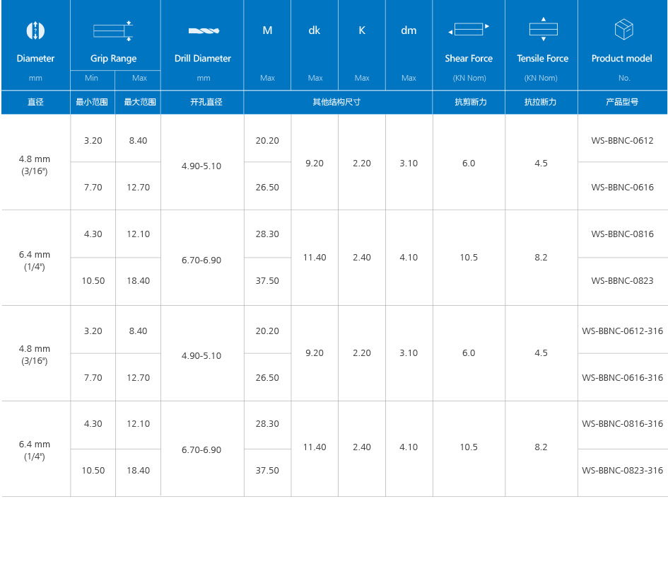 1.极佳的孔填充性能,牢固抗震的铆接效果,通过迅速膨胀的铆帽来实现;能对不规则、超差孔、长圆或者错为孔进行补偿铆接。